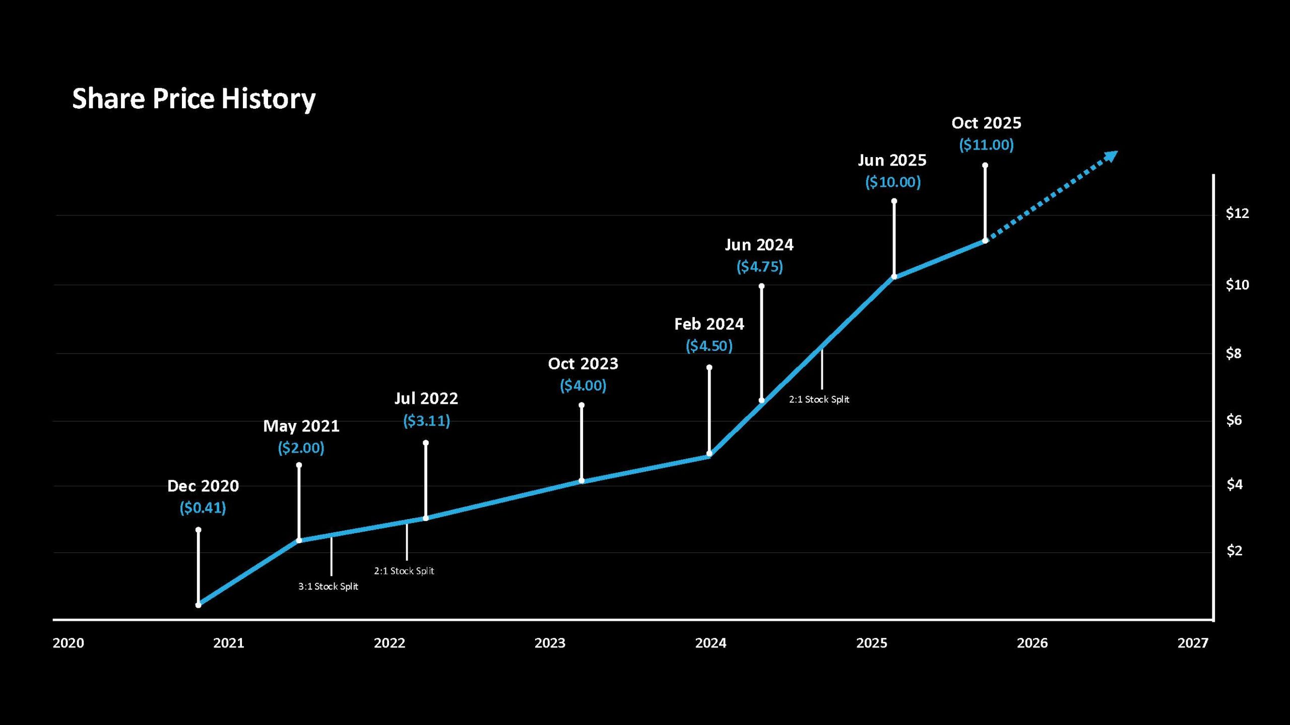 When pricing our current offering, we highlighted several inflection points that correlated with higher offering prices over time, e.g., price increases following GM’s investment, our Chile acreage acquisition, and the Project Lonestar™ Lithium announcement; a significant re-rating after the independent pre-feasibility study for Project Black Giant™, and a stock split that set our current offering at $11/share to broaden access in this commercialization phase. As you can see from the chart below, our share price has steadily increased over time as we’ve reached key milestones.‍