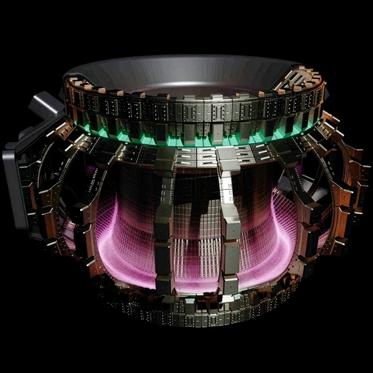 A tokamak reactor is one of the most highly pursued fusion reactor types. It is a magnetic confinement fusion reactor that uses extremely strong magnetic fields to confine a super-hot plasma in a donut-shaped (toroidal) chamber. The goal is to hold plasma hot and dense enough, for long enough, that deuterium–tritium (D-T) fusion occurs continuously. Deuterium and tritium gas are injected, gas is ionized into plasma, and temperatures reach ~100 million °C. Tritium, the main fuel source of fusion reactors, is bred from Lithium-6.