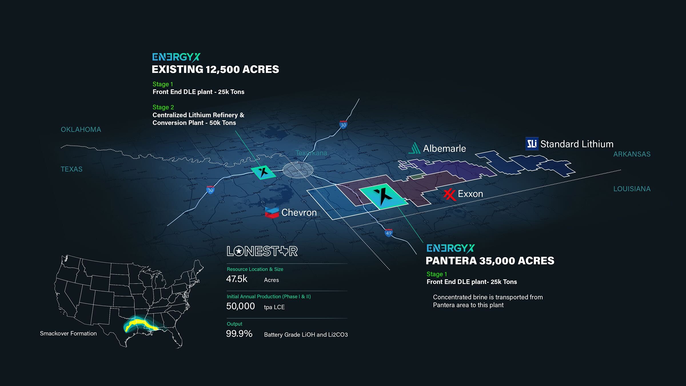 EnergyX is building a $10 million demonstration plant in East Texas ($5 million DOE contribution), and has executed definitive option agreements for lithium resource acreage in the Smackover for Project Lonestar™.